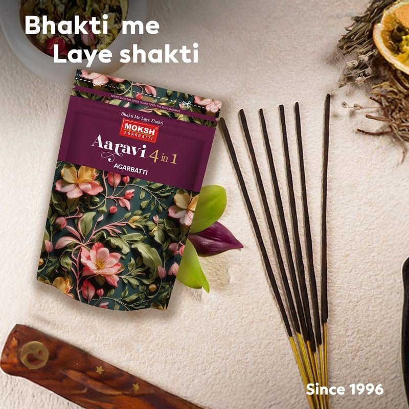 Moksh 4in1 Incense Sticks | Aaravi | Premium Fragrances | Long-Lasting Aroma | Mega Zipper Pouch | Ideal for Pooja, Meditation & Home Ambiance (400g) Pack of 1